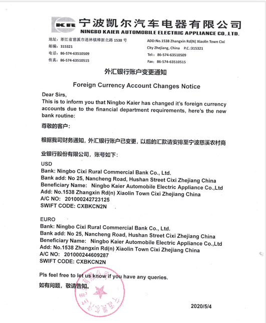 尊敬的客戶: 根據我司財務通知,外匯銀行賬戶己変更,以后的,以后的匯款請安排至寧波慈溪農村商業銀行股份有限公司